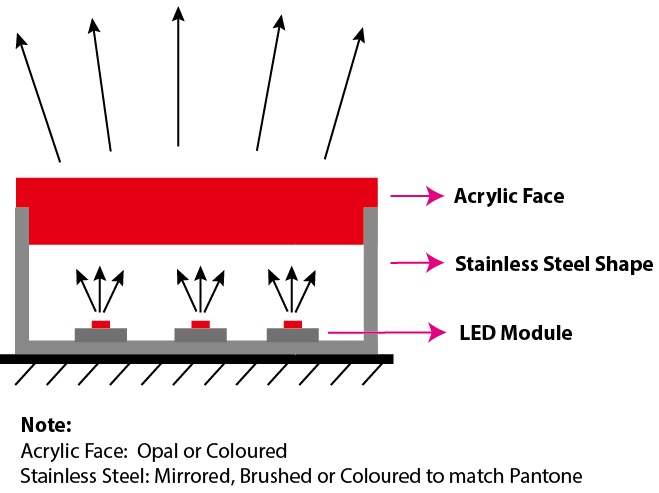 - Red Acrylic face, brushed stainless body, LED Frontlit